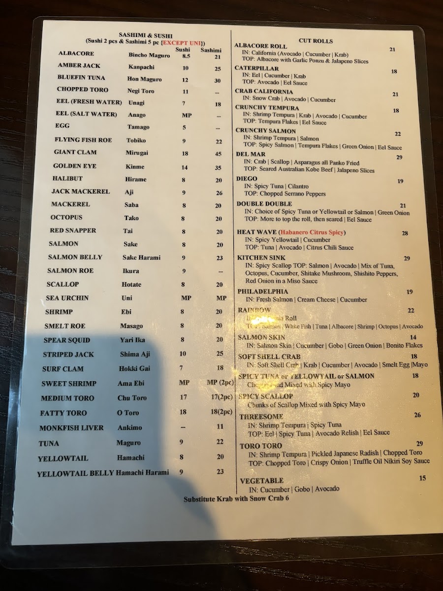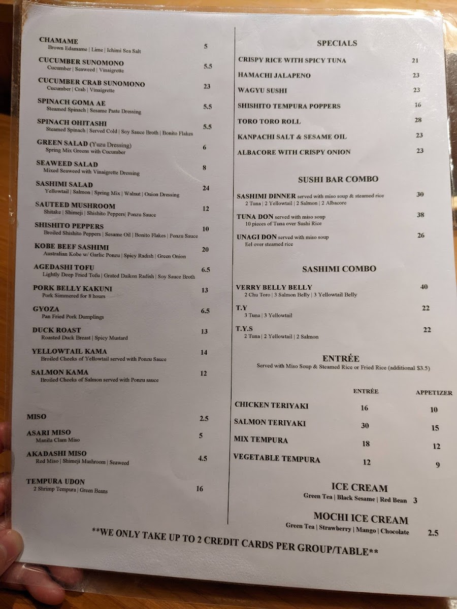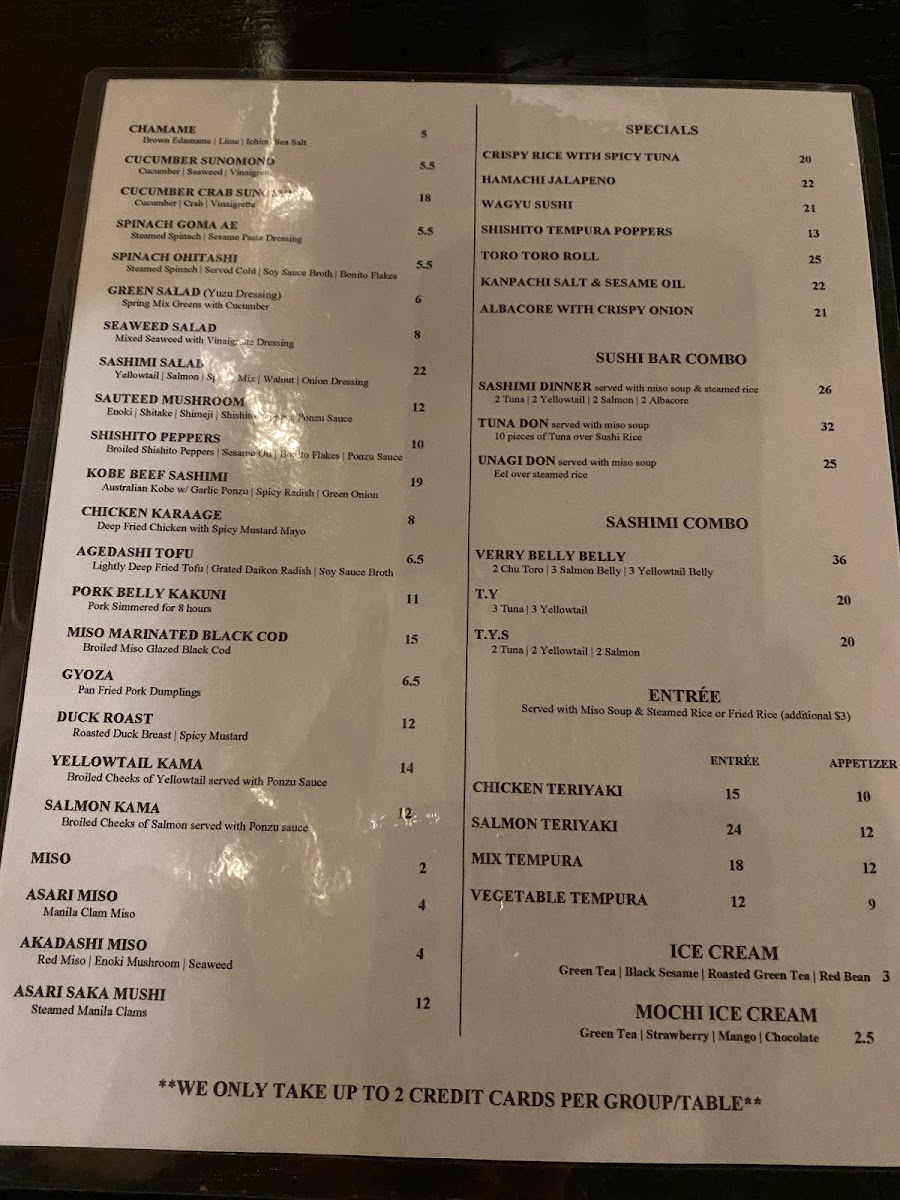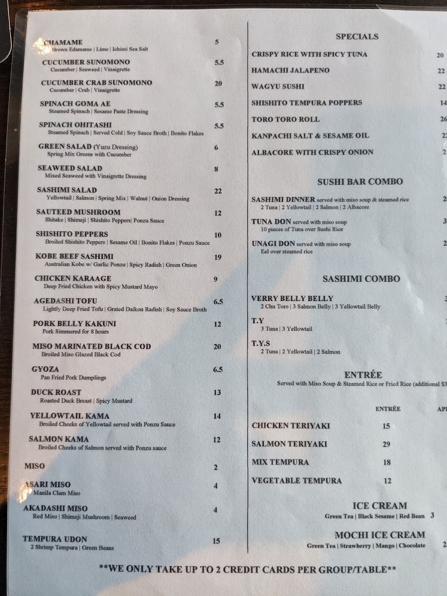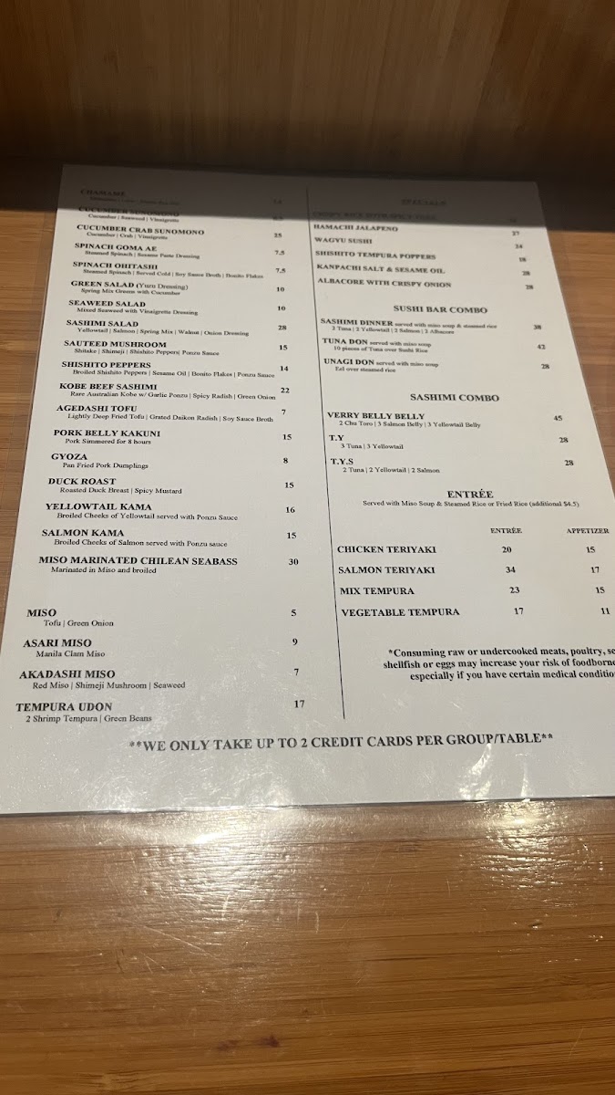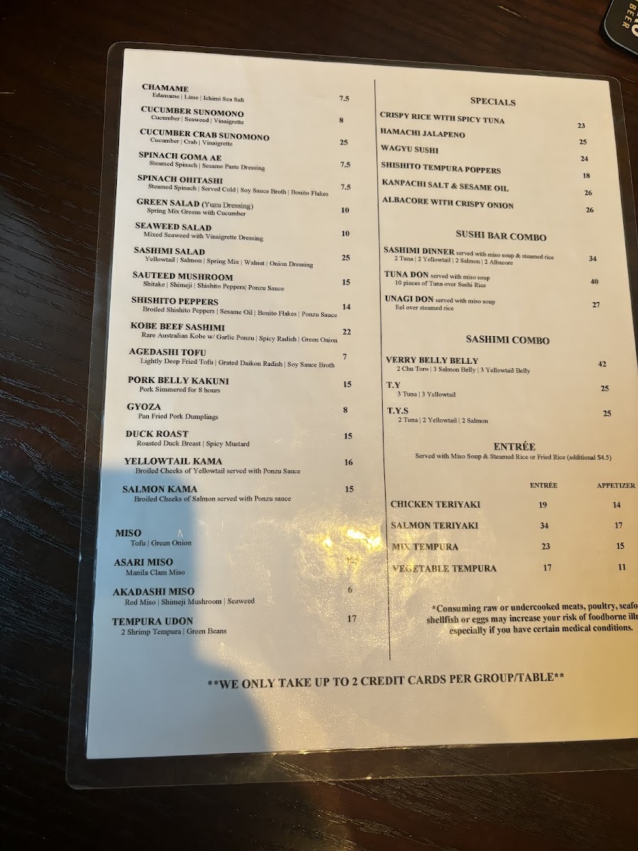 The menu features a range of options from classic nigiri and sashimi to bold rolls like the Toro Toro Roll and Crunchy Salmon. Small plates such as Crispy Rice with Spicy Tuna and Pork Belly Kakuni provide satisfying bites to share, while warm dishes like Tempura Udon and Teppanyaki offer comforting variety. Seasonal oysters and fresh seafood are also featured, complementing a lineup of carefully chosen sake and shochu to round out the experience.